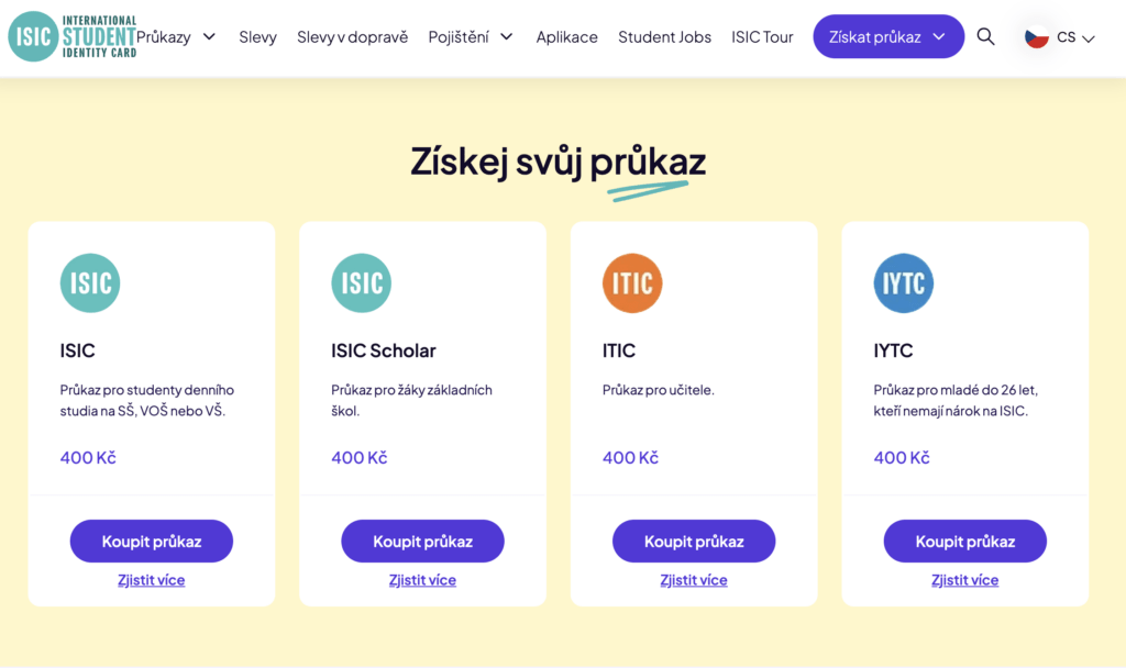 Program nabízí cenové zvýhodnění pro studenty i pedagogy, kteří vlastní platný průkaz ISIC nebo ITIC.