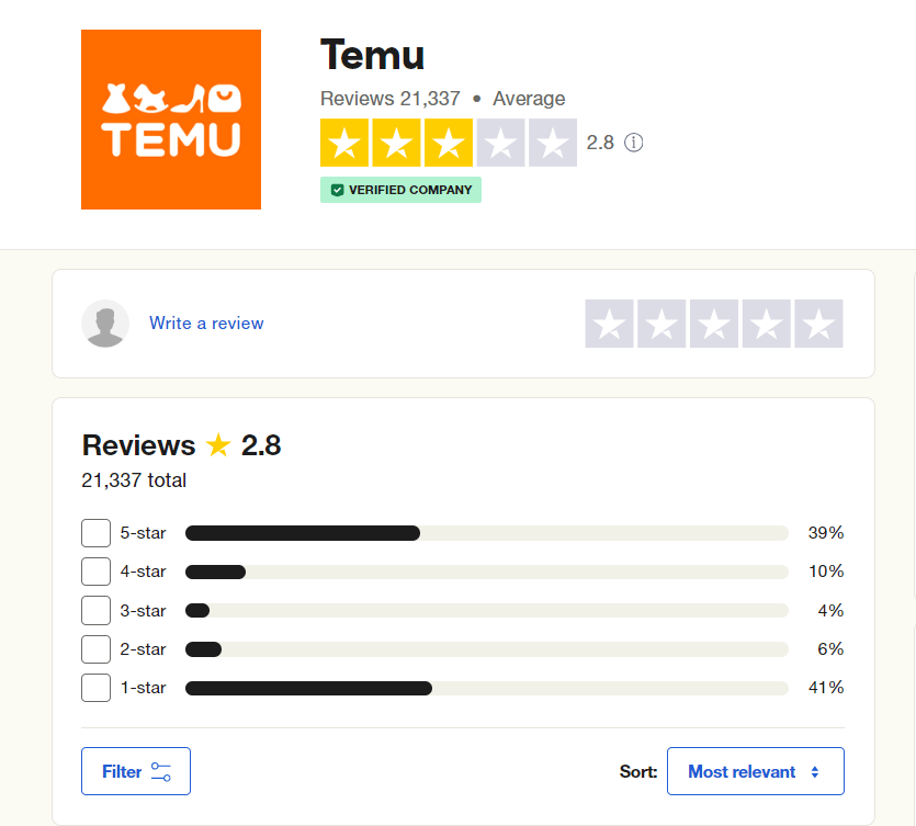 Hodnocení eshopu Temu na webu Trustpilot.com.