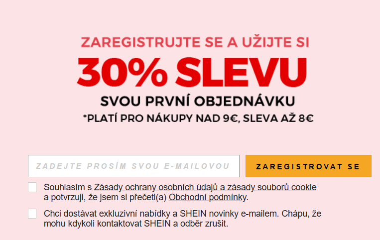 Jak již bylo zmíněno, při nákupu v e-shopu Shein je potřeba registrace. Proces registrace je jednoduchý a zabere jen pár minut. Do registračního formuláře se zadává e-mailová adresa a heslo. Zákazník také potvrzuje souhlas se zpracováním osobních údajů.