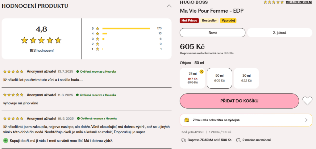 Po kliknutí na odkaz Hodnocení je nakupující přesměrován na slovní recenze k danému produktu. Ty mohou být velmi nápomocné při výběru zboží. Na obrázku níže jsou například recenze Vivantis parfému Hugo Boss Ma Vie, jehož celkové hodnocení dosahuje 5 hvězdiček od 193 lidí.