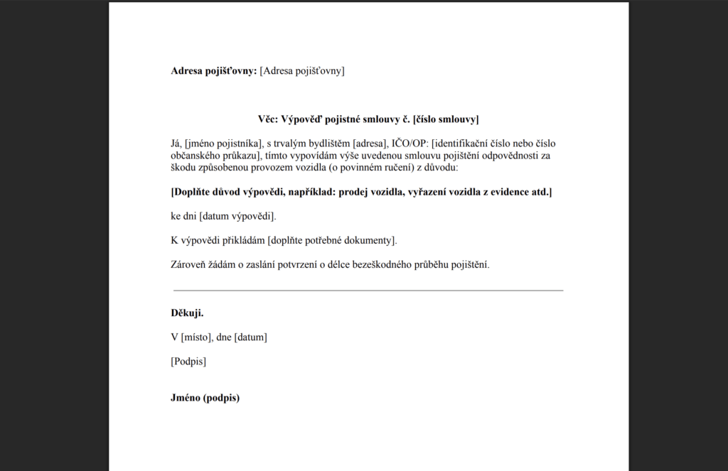 Vzor výpovědi povinného ručení v PDF usnadňuje přípravu dokumentu a minimalizuje riziko formálních chyb.